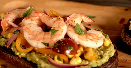 - To serve; over one side of toast, top with avocado spread then add corn pico topping and shrimp, season with salt and pepper.